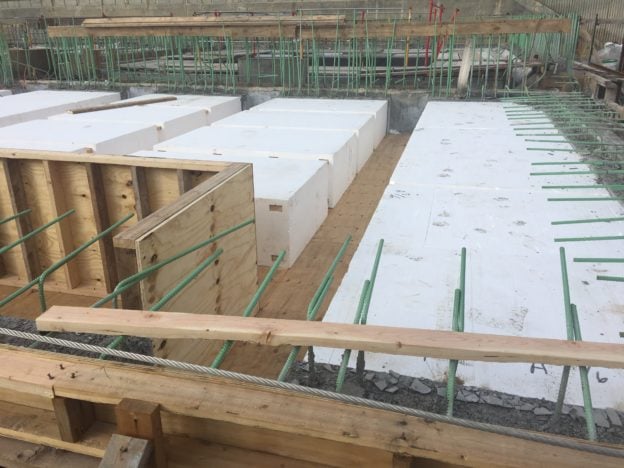 When a grade beam foundation is required above ground, using expanded polystyrene blocks to form the beams is a logical solution. The blocks are lightweight and easy to handle, allowing for a rapid installation. They can be delivered to the site precut and ready to install. If chamfered edges are required they can be easily cut on site using an EPS hot knife or precut at the factory prior to delivery. The blocks are typically anchored in place using rebar or straps with earth augers to prevent movement during concrete installation. EPS has a high R-Value providing a well-insulated floor.